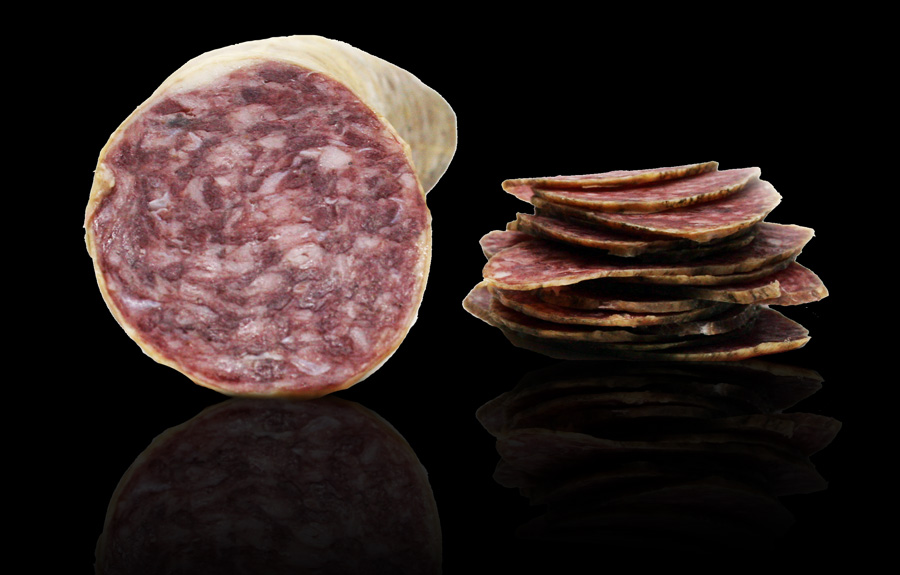 INGREDIENTES: Magro de cerdo, LECHE en polvo, humectante (sorbitol E-420i), sal común, dextrina, dextrosa, especias, regulador de pH (E-575), aroma, potenciador del sabor E-621, proteína aislada de SOJA, proteína de LECHE, emulgentes (E-450i, E-452i, E-451i), conservadores (E-252, E-250), antioxidantes (E-392), colorante (E-120), pimienta y nuez moscada. Tripa natural de cerdo. SIN GLUTEN. CON LACTOSA.